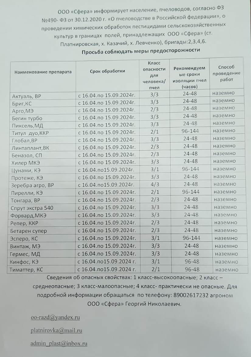 Информация о проведении химических обработок пестицидами сельскохозяйственных культур в границах полей