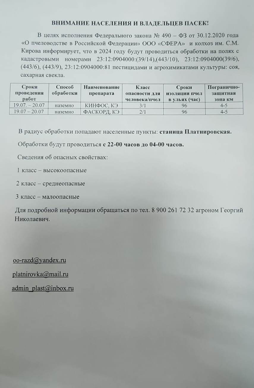 Информация о проведении химических обработок пестицидами и агрохимикатами сельскохозяйственных культур в границах полей